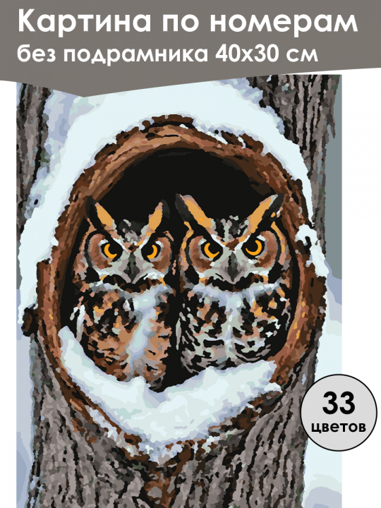 Картина по номерам без подрамника, размер 40х30 см, произведена нами. Она включает 40 оттенков и 2873 контуров, что придаёт ей глубину цвета и плавные переходы. Картина выглядит более ярко и живо. В комплект входит глянцевый лак, которым можно покрыть работу по желанию. Краски имеют хорошую укрывистость, хватает двух проходов что бы закрасить символы на схеме. Так же они сохраняют текстуру мазков, не растекаясь и не разглаживаясь полностью на холсте. При покрытии глянцевым лаком создаётся эффект приближенный к масляной живописи. Краски упакованы герметично, что сохраняет их жидкими. Все необходимые инструменты для начала работы также входят в комплект. Мы не используем экосольвентные чернила, которые содержат свинец и могут быть вредны для здоровья. Наши картины напечатаны безопасными водными пигментными чернилами, обеспечивающими чёткое изображение и легко читаемые обозначения. Холст плотный, имеет мелкую зернистость, легко разглаживается и устойчив к сминанию. Картина поставляется в бурой коробке. Следует отметить, что картина без подрамника её нельзя натянуть на подрамник из-за узких краёв, она предназначена для оформления в рамочку. Две совы сидят в дупле дерева, покрытого снегом; их острые, оранжевые глаза выделяются на фоне коричневых и серых перьев, создавая контраст с зимним окружением.