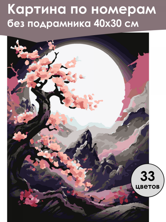 Картина по номерам без подрамника, размер 40х30 см, произведена нами. Она включает 40 оттенков и 1367 контуров, что придаёт ей глубину цвета и плавные переходы. Картина выглядит более ярко и живо. В комплект входит глянцевый лак, которым можно покрыть работу по желанию. Краски имеют хорошую укрывистость, хватает двух проходов что бы закрасить символы на схеме. Так же они сохраняют текстуру мазков, не растекаясь и не разглаживаясь полностью на холсте. При покрытии глянцевым лаком создаётся эффект приближенный к масляной живописи. Краски упакованы герметично, что сохраняет их жидкими. Все необходимые инструменты для начала работы также входят в комплект. Мы не используем экосольвентные чернила, которые содержат свинец и могут быть вредны для здоровья. Наши картины напечатаны безопасными водными пигментными чернилами, обеспечивающими чёткое изображение и легко читаемые обозначения. Холст плотный, имеет мелкую зернистость, легко разглаживается и устойчив к сминанию. Картина поставляется в бурой коробке. Следует отметить, что картина без подрамника её нельзя натянуть на подрамник из-за узких краёв, она предназначена для оформления в рамочку. Пейзаж с цветущей сакурой на первом плане, её розовые цветы контрастируют с темным силуэтом изогнутого ствола, на заднем плане видны величественные горы, осененные ярким светом огромной круглой луны, создавая атмосферу таинственной ночи.