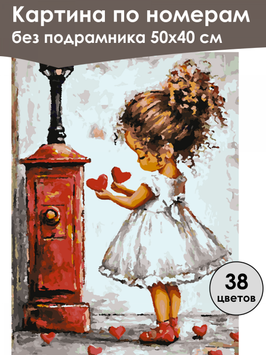 Картина по номерам без подрамника, размер 50х40 см, произведена нами. Она включает 40 оттенков и 2902 контуров, что придаёт ей глубину цвета и плавные переходы. Картина выглядит более ярко и живо. В комплект входит глянцевый лак, которым можно покрыть работу по желанию. Краски имеют хорошую укрывистость, хватает двух проходов что бы закрасить символы на схеме. Так же они сохраняют текстуру мазков, не растекаясь и не разглаживаясь полностью на холсте. При покрытии глянцевым лаком создаётся эффект приближенный к масляной живописи. Краски упакованы герметично, что сохраняет их жидкими. Все необходимые инструменты для начала работы также входят в комплект. Мы не используем экосольвентные чернила, которые содержат свинец и могут быть вредны для здоровья. Наши картины напечатаны безопасными водными пигментными чернилами, обеспечивающими чёткое изображение и легко читаемые обозначения. Холст плотный, имеет мелкую зернистость, легко разглаживается и устойчив к сминанию. Картина поставляется в бурой коробке. Следует отметить, что картина без подрамника её нельзя натянуть на подрамник из-за узких краёв, она предназначена для оформления в рамочку. Маленькая девочка с кудрявыми волосами, одетая в белое платье и красные туфли, стоящая рядом с красным почтовым ящиком; в руках она держит красные сердечки, а на земле рядом с ней тоже лежат сердечки.
