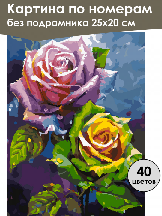 Картина по номерам без подрамника, размер 25х20 см, произведена нами. Она включает 40 оттенков и 954 контуров, что придаёт ей глубину цвета и плавные переходы. Картина выглядит более ярко и живо. В комплект входит глянцевый лак, которым можно покрыть работу по желанию. Краски качественные, имеют хорошую укрывистость, хватает двух проходов что бы закрасить символы на схеме. Они упакованы герметично, что сохраняет их жидкими. Все необходимые инструменты для начала работы также включены в комплект. Мы не используем экосольвентные чернила, которые содержат свинец и могут быть вредны для здоровья. Наши картины напечатаны безопасными водными пигментными чернилами, обеспечивающими чёткое изображение и легко читаемые обозначения. Холст плотный, имеет мелкую зернистость, легко разглаживается и устойчив к сминанию. Картина поставляется в бурой коробке. Следует отметить, что картина без подрамника её нельзя натянуть на подрамник из-за узких краёв, она предназначена для оформления в рамочку. Две розы в стиле цифровой живописи: верхняя роза нежно-розового цвета с каплями воды на лепестках, а нижняя — ярко-жёлтая с насыщенными зелёными листьями, фон изображён абстрактными оттенками синего и зелёного.