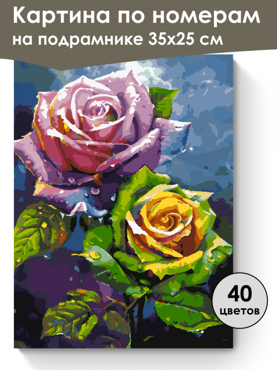 Картина по номерам на подрамнике, размер 35х25 см, произведена нами. Она включает 40 оттенков и 1277 контуров, что придаёт ей глубину цвета и плавные переходы. Картина выглядит более ярко и живо. В комплект входит глянцевый лак, которым можно покрыть работу по желанию. Краски имеют хорошую укрывистость, хватает двух проходов что бы закрасить символы на схеме. Так же они сохраняют текстуру мазков, не растекаясь и не разглаживаясь полностью на холсте. При покрытии глянцевым лаком создаётся эффект приближенный к масляной живописи. Краски упакованы герметично, что сохраняет их жидкими. Все необходимые инструменты для начала работы также включены в комплект, в том числе и крепления на стену. В картине используется крепкий подрамник со специальной вставкой, которая предотвращает провисание холста во время рисования. Это обеспечивает комфортный процесс работы и гарантирует, что холст всегда будет оставаться хорошо натянутым. Мы не используем экосольвентные чернила, которые содержат свинец и могут быть вредны для здоровья. Наши картины напечатаны безопасными водными пигментными чернилами, обеспечивающими чёткое изображение и легко читаемые обозначения. Холст плотный, имеет мелкую зернистость, легко разглаживается и устойчив к сминанию. Картина поставляется в защищённой бурой коробке. Две розы в стиле цифровой живописи: верхняя роза нежно-розового цвета с каплями воды на лепестках, а нижняя — ярко-жёлтая с насыщенными зелёными листьями, фон изображён абстрактными оттенками синего и зелёного.
