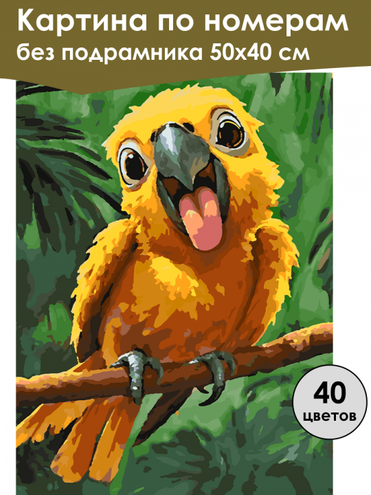 Картина по номерам без подрамника, размер 50х40 см, произведена нами. Она включает 40 оттенков и 1408 контуров, что придаёт ей глубину цвета и плавные переходы. Картина выглядит более ярко и живо. В комплект входит глянцевый лак, которым можно покрыть работу по желанию. Краски имеют хорошую укрывистость, хватает двух проходов что бы закрасить символы на схеме. Так же они сохраняют текстуру мазков, не растекаясь и не разглаживаясь полностью на холсте. При покрытии глянцевым лаком создаётся эффект приближенный к масляной живописи. Краски упакованы герметично, что сохраняет их жидкими. Все необходимые инструменты для начала работы также входят в комплект. Мы не используем экосольвентные чернила, которые содержат свинец и могут быть вредны для здоровья. Наши картины напечатаны безопасными водными пигментными чернилами, обеспечивающими чёткое изображение и легко читаемые обозначения. Холст плотный, имеет мелкую зернистость, легко разглаживается и устойчив к сминанию. Картина поставляется в бурой коробке. Следует отметить, что картина без подрамника её нельзя натянуть на подрамник из-за узких краёв, она предназначена для оформления в рамочку. Яркий жёлтый попугай сидит на ветке, он распахнул клюв и кажется, что он издает крик или поёт; фон состоит из насыщенной зелени, создавая тропическую атмосферу.