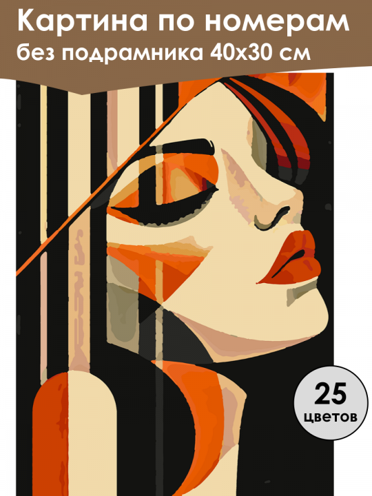 Картина по номерам без подрамника, размер 40х30 см, произведена нами. Она включает 40 оттенков и 227 контуров, что придаёт ей глубину цвета и плавные переходы. Картина выглядит более ярко и живо. В комплект входит глянцевый лак, которым можно покрыть работу по желанию. Краски имеют хорошую укрывистость, хватает двух проходов что бы закрасить символы на схеме. Так же они сохраняют текстуру мазков, не растекаясь и не разглаживаясь полностью на холсте. При покрытии глянцевым лаком создаётся эффект приближенный к масляной живописи. Краски упакованы герметично, что сохраняет их жидкими. Все необходимые инструменты для начала работы также входят в комплект. Мы не используем экосольвентные чернила, которые содержат свинец и могут быть вредны для здоровья. Наши картины напечатаны безопасными водными пигментными чернилами, обеспечивающими чёткое изображение и легко читаемые обозначения. Холст плотный, имеет мелкую зернистость, легко разглаживается и устойчив к сминанию. Картина поставляется в бурой коробке. Следует отметить, что картина без подрамника её нельзя натянуть на подрамник из-за узких краёв, она предназначена для оформления в рамочку. Абстрактный портрет с женским профилем, выполненный в стиле ар-деко, с использованием ярких оттенков оранжевого, черного и кремового; лицо изображено с высокой контрастностью и геометрическими линиями, создающими эффектную композицию с элементами динамики и градиентных переходов.