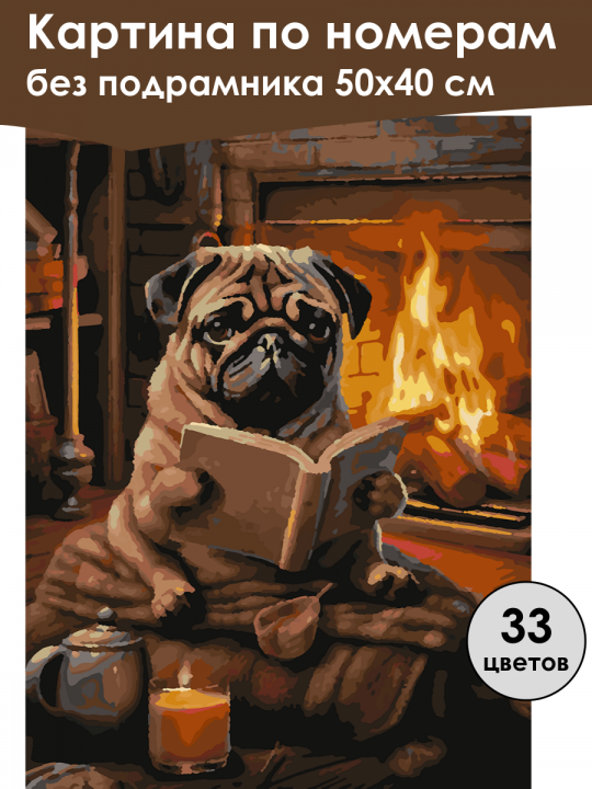 Картина по номерам без подрамника, размер 50х40 см, произведена нами. Она включает 40 оттенков и 2026 контуров, что придаёт ей глубину цвета и плавные переходы. Картина выглядит более ярко и живо. В комплект входит глянцевый лак, которым можно покрыть работу по желанию. Краски имеют хорошую укрывистость, хватает двух проходов что бы закрасить символы на схеме. Так же они сохраняют текстуру мазков, не растекаясь и не разглаживаясь полностью на холсте. При покрытии глянцевым лаком создаётся эффект приближенный к масляной живописи. Краски упакованы герметично, что сохраняет их жидкими. Все необходимые инструменты для начала работы также входят в комплект. Мы не используем экосольвентные чернила, которые содержат свинец и могут быть вредны для здоровья. Наши картины напечатаны безопасными водными пигментными чернилами, обеспечивающими чёткое изображение и легко читаемые обозначения. Холст плотный, имеет мелкую зернистость, легко разглаживается и устойчив к сминанию. Картина поставляется в бурой коробке. Следует отметить, что картина без подрамника её нельзя натянуть на подрамник из-за узких краёв, она предназначена для оформления в рамочку. Мультяшный мопс сидит перед камином с горящей свечой и чайником, держит книгу, создавая атмосферу уюта и спокойствия в тёплом деревянном интерьере.
