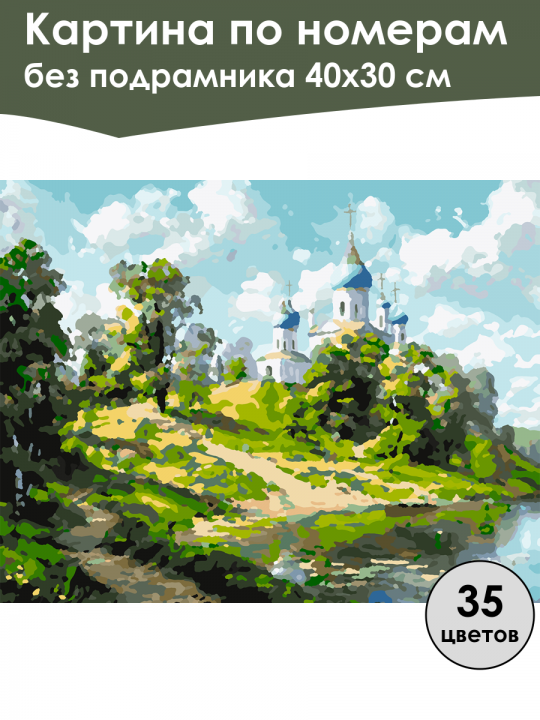 Картина по номерам без подрамника, размер 40х30 см, произведена нами. Она включает 40 оттенков и 2221 контуров, что придаёт ей глубину цвета и плавные переходы. Картина выглядит более ярко и живо. В комплект входит глянцевый лак, которым можно покрыть работу по желанию. Краски имеют хорошую укрывистость, хватает двух проходов что бы закрасить символы на схеме. Так же они сохраняют текстуру мазков, не растекаясь и не разглаживаясь полностью на холсте. При покрытии глянцевым лаком создаётся эффект приближенный к масляной живописи. Краски упакованы герметично, что сохраняет их жидкими. Все необходимые инструменты для начала работы также входят в комплект. Мы не используем экосольвентные чернила, которые содержат свинец и могут быть вредны для здоровья. Наши картины напечатаны безопасными водными пигментными чернилами, обеспечивающими чёткое изображение и легко читаемые обозначения. Холст плотный, имеет мелкую зернистость, легко разглаживается и устойчив к сминанию. Картина поставляется в бурой коробке. Следует отметить, что картина без подрамника её нельзя натянуть на подрамник из-за узких краёв, она предназначена для оформления в рамочку. Пейзаж с нарисованной церковью с синими куполами на холме среди зелёных деревьев, отражающихся в реке, под солнечным небом с облаками.