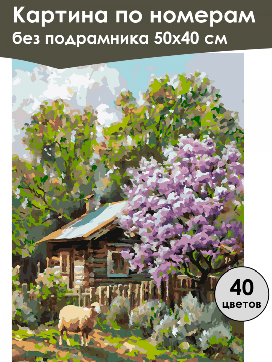 Картина по номерам без подрамника, размер 50х40 см, произведена нами. Она включает 40 оттенков и 4058 контуров, что придаёт ей глубину цвета и плавные переходы. Картина выглядит более ярко и живо. В комплект входит глянцевый лак, которым можно покрыть работу по желанию. Краски имеют хорошую укрывистость, хватает двух проходов что бы закрасить символы на схеме. Так же они сохраняют текстуру мазков, не растекаясь и не разглаживаясь полностью на холсте. При покрытии глянцевым лаком создаётся эффект приближенный к масляной живописи. Краски упакованы герметично, что сохраняет их жидкими. Все необходимые инструменты для начала работы также входят в комплект. Мы не используем экосольвентные чернила, которые содержат свинец и могут быть вредны для здоровья. Наши картины напечатаны безопасными водными пигментными чернилами, обеспечивающими чёткое изображение и легко читаемые обозначения. Холст плотный, имеет мелкую зернистость, легко разглаживается и устойчив к сминанию. Картина поставляется в бурой коробке. Следует отметить, что картина без подрамника её нельзя натянуть на подрамник из-за узких краёв, она предназначена для оформления в рамочку. Пасторальная сцена с деревянным домиком, окружённым зелёными деревьями и цветущими кустами сирени, на переднем плане стоит овца, а на фоне видны большие белые облака на синем небе.