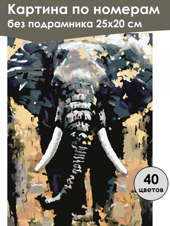 Картина по номерам без подрамника, размер 25х20 см, произведена нами. Она включает 40 оттенков и 1314 контуров, что придаёт ей глубину цвета и плавные переходы. Картина выглядит более ярко и живо. В комплект входит глянцевый лак, которым можно покрыть работу по желанию. Краски качественные, имеют хорошую укрывистость, хватает двух проходов что бы закрасить символы на схеме. Они упакованы герметично, что сохраняет их жидкими. Все необходимые инструменты для начала работы также включены в комплект. Мы не используем экосольвентные чернила, которые содержат свинец и могут быть вредны для здоровья. Наши картины напечатаны безопасными водными пигментными чернилами, обеспечивающими чёткое изображение и легко читаемые обозначения. Холст плотный, имеет мелкую зернистость, легко разглаживается и устойчив к сминанию. Картина поставляется в бурой коробке. Следует отметить, что картина без подрамника её нельзя натянуть на подрамник из-за узких краёв, она предназначена для оформления в рамочку. Африканский слон, выполненный с эффектом пастеризации, с акцентом на его мощные бивни и текстурированную шероховатую кожу; фон состоит из размытых оттенков коричневого и зеленого, создающих иллюзию дикой природы.