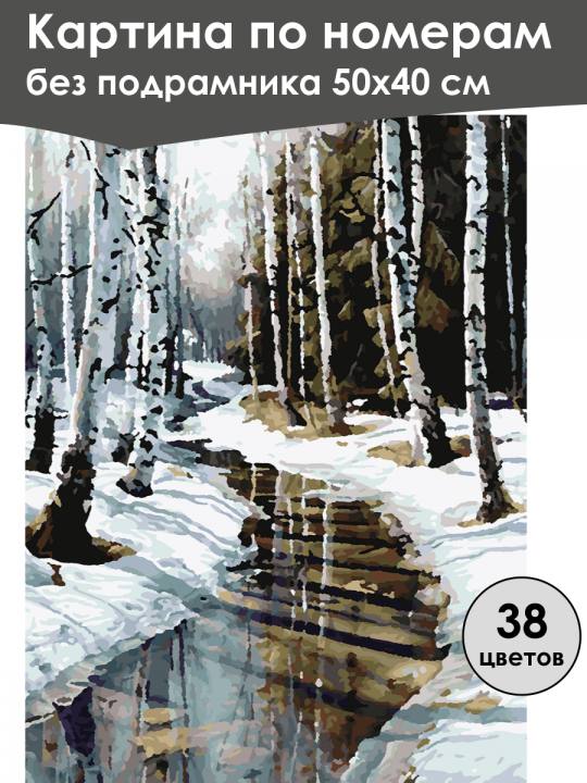 Картина по номерам без подрамника, размер 50х40 см, произведена нами. Она включает 40 оттенков и 3858 контуров, что придаёт ей глубину цвета и плавные переходы. Картина выглядит более ярко и живо. В комплект входит глянцевый лак, которым можно покрыть работу по желанию. Краски имеют хорошую укрывистость, хватает двух проходов что бы закрасить символы на схеме. Так же они сохраняют текстуру мазков, не растекаясь и не разглаживаясь полностью на холсте. При покрытии глянцевым лаком создаётся эффект приближенный к масляной живописи. Краски упакованы герметично, что сохраняет их жидкими. Все необходимые инструменты для начала работы также входят в комплект. Мы не используем экосольвентные чернила, которые содержат свинец и могут быть вредны для здоровья. Наши картины напечатаны безопасными водными пигментными чернилами, обеспечивающими чёткое изображение и легко читаемые обозначения. Холст плотный, имеет мелкую зернистость, легко разглаживается и устойчив к сминанию. Картина поставляется в бурой коробке. Следует отметить, что картина без подрамника её нельзя натянуть на подрамник из-за узких краёв, она предназначена для оформления в рамочку. Зимний пейзаж с берёзовым лесом, где деревья тонкими белыми стволами тянутся вверх, окружённые снегом, а между ними течёт ручей с зеркальной поверхностью, отражающей голубоватое небо и зимнюю природу, создавая атмосферу спокойствия и прохлады.