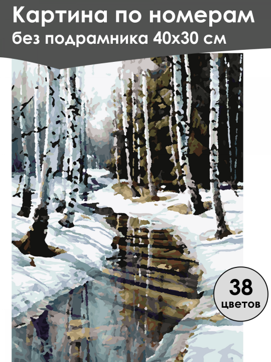 Картина по номерам без подрамника, размер 40х30 см, произведена нами. Она включает 40 оттенков и 3345 контуров, что придаёт ей глубину цвета и плавные переходы. Картина выглядит более ярко и живо. В комплект входит глянцевый лак, которым можно покрыть работу по желанию. Краски имеют хорошую укрывистость, хватает двух проходов что бы закрасить символы на схеме. Так же они сохраняют текстуру мазков, не растекаясь и не разглаживаясь полностью на холсте. При покрытии глянцевым лаком создаётся эффект приближенный к масляной живописи. Краски упакованы герметично, что сохраняет их жидкими. Все необходимые инструменты для начала работы также входят в комплект. Мы не используем экосольвентные чернила, которые содержат свинец и могут быть вредны для здоровья. Наши картины напечатаны безопасными водными пигментными чернилами, обеспечивающими чёткое изображение и легко читаемые обозначения. Холст плотный, имеет мелкую зернистость, легко разглаживается и устойчив к сминанию. Картина поставляется в бурой коробке. Следует отметить, что картина без подрамника её нельзя натянуть на подрамник из-за узких краёв, она предназначена для оформления в рамочку. Зимний пейзаж с берёзовым лесом, где деревья тонкими белыми стволами тянутся вверх, окружённые снегом, а между ними течёт ручей с зеркальной поверхностью, отражающей голубоватое небо и зимнюю природу, создавая атмосферу спокойствия и прохлады.