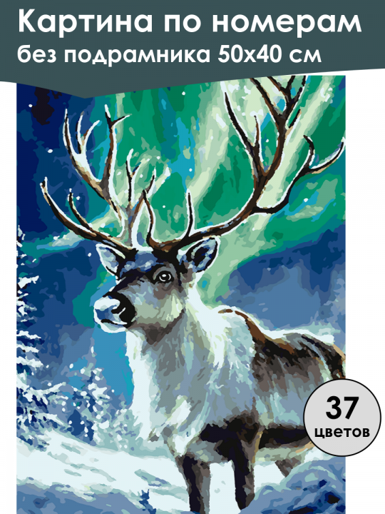 Картина по номерам без подрамника, размер 50х40 см, произведена нами. Она включает 40 оттенков и 2602 контуров, что придаёт ей глубину цвета и плавные переходы. Картина выглядит более ярко и живо. В комплект входит глянцевый лак, которым можно покрыть работу по желанию. Краски имеют хорошую укрывистость, хватает двух проходов что бы закрасить символы на схеме. Так же они сохраняют текстуру мазков, не растекаясь и не разглаживаясь полностью на холсте. При покрытии глянцевым лаком создаётся эффект приближенный к масляной живописи. Краски упакованы герметично, что сохраняет их жидкими. Все необходимые инструменты для начала работы также входят в комплект. Мы не используем экосольвентные чернила, которые содержат свинец и могут быть вредны для здоровья. Наши картины напечатаны безопасными водными пигментными чернилами, обеспечивающими чёткое изображение и легко читаемые обозначения. Холст плотный, имеет мелкую зернистость, легко разглаживается и устойчив к сминанию. Картина поставляется в бурой коробке. Следует отметить, что картина без подрамника её нельзя натянуть на подрамник из-за узких краёв, она предназначена для оформления в рамочку. Северный олень с величественными рогами на фоне зимнего пейзажа, окружённого заснеженными деревьями, с яркими зелёно-голубыми оттенками северного сияния на небе.