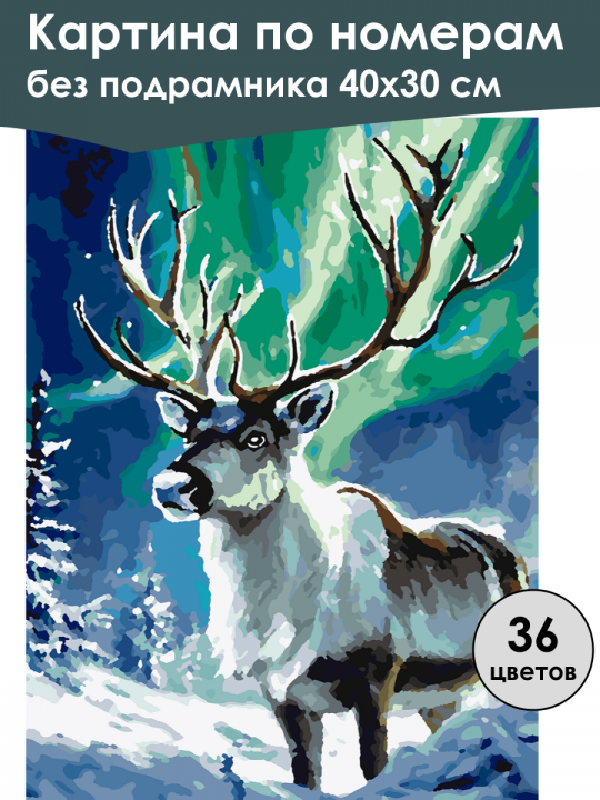 Картина по номерам без подрамника, размер 40х30 см, произведена нами. Она включает 40 оттенков и 1609 контуров, что придаёт ей глубину цвета и плавные переходы. Картина выглядит более ярко и живо. В комплект входит глянцевый лак, которым можно покрыть работу по желанию. Краски имеют хорошую укрывистость, хватает двух проходов что бы закрасить символы на схеме. Так же они сохраняют текстуру мазков, не растекаясь и не разглаживаясь полностью на холсте. При покрытии глянцевым лаком создаётся эффект приближенный к масляной живописи. Краски упакованы герметично, что сохраняет их жидкими. Все необходимые инструменты для начала работы также входят в комплект. Мы не используем экосольвентные чернила, которые содержат свинец и могут быть вредны для здоровья. Наши картины напечатаны безопасными водными пигментными чернилами, обеспечивающими чёткое изображение и легко читаемые обозначения. Холст плотный, имеет мелкую зернистость, легко разглаживается и устойчив к сминанию. Картина поставляется в бурой коробке. Следует отметить, что картина без подрамника её нельзя натянуть на подрамник из-за узких краёв, она предназначена для оформления в рамочку. Северный олень с величественными рогами на фоне зимнего пейзажа, окружённого заснеженными деревьями, с яркими зелёно-голубыми оттенками северного сияния на небе.
