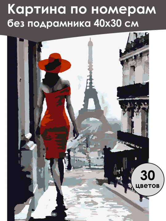 Картина по номерам без подрамника, размер 40х30 см, произведена нами. Она включает 40 оттенков и 1306 контуров, что придаёт ей глубину цвета и плавные переходы. Картина выглядит более ярко и живо. В комплект входит глянцевый лак, которым можно покрыть работу по желанию. Краски имеют хорошую укрывистость, хватает двух проходов что бы закрасить символы на схеме. Так же они сохраняют текстуру мазков, не растекаясь и не разглаживаясь полностью на холсте. При покрытии глянцевым лаком создаётся эффект приближенный к масляной живописи. Краски упакованы герметично, что сохраняет их жидкими. Все необходимые инструменты для начала работы также входят в комплект. Мы не используем экосольвентные чернила, которые содержат свинец и могут быть вредны для здоровья. Наши картины напечатаны безопасными водными пигментными чернилами, обеспечивающими чёткое изображение и легко читаемые обозначения. Холст плотный, имеет мелкую зернистость, легко разглаживается и устойчив к сминанию. Картина поставляется в бурой коробке. Следует отметить, что картина без подрамника её нельзя натянуть на подрамник из-за узких краёв, она предназначена для оформления в рамочку. Девушка в красном платье и шляпе идет по улице в Париже, видна Эйфелева башня на заднем плане, образ создаёт атмосферу элегантности и романтики среди старинной архитектуры.