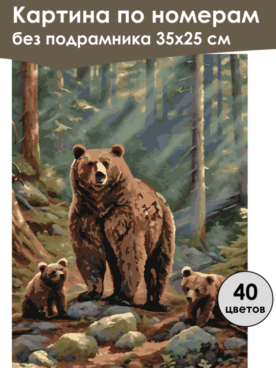 Картина по номерам без подрамника, размер 35х25 см, произведена нами. Она включает 40 оттенков и 2892 контуров, что придаёт ей глубину цвета и плавные переходы. Картина выглядит более ярко и живо. В комплект входит глянцевый лак, которым можно покрыть работу по желанию. Краски качественные, имеют хорошую укрывистость, хватает двух проходов что бы закрасить символы на схеме. Они упакованы герметично, что сохраняет их жидкими. Все необходимые инструменты для начала работы также включены в комплект. Мы не используем экосольвентные чернила, которые содержат свинец и могут быть вредны для здоровья. Наши картины напечатаны безопасными водными пигментными чернилами, обеспечивающими чёткое изображение и легко читаемые обозначения. Холст плотный, имеет мелкую зернистость, легко разглаживается и устойчив к сминанию. Картина поставляется в защищённой бурой коробке. Следует отметить, что картина без подрамника её нельзя натянуть на подрамник из-за узких краёв, она предназначена для оформления в рамочку. Медведица с двумя медвежатами, стоящих на земле в лесной обстановке, вокруг них высокие деревья, солнечный свет пробивается сквозь ветви, создавая тёплую и спокойную атмосферу природы.