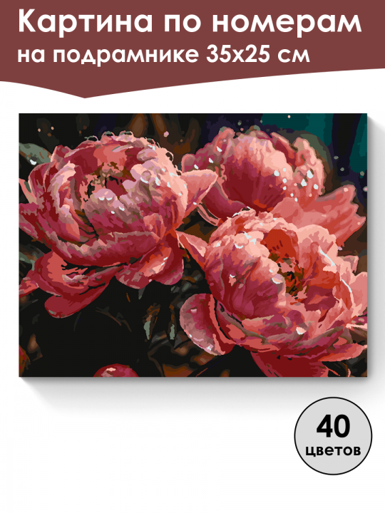 Картина по номерам на подрамнике, размер 35х25 см, произведена нами. Она включает 40 оттенков и 2022 контуров, что придаёт ей глубину цвета и плавные переходы. Картина выглядит более ярко и живо. В комплект входит глянцевый лак, которым можно покрыть работу по желанию. Краски имеют хорошую укрывистость, хватает двух проходов что бы закрасить символы на схеме. Так же они сохраняют текстуру мазков, не растекаясь и не разглаживаясь полностью на холсте. При покрытии глянцевым лаком создаётся эффект приближенный к масляной живописи. Краски упакованы герметично, что сохраняет их жидкими. Все необходимые инструменты для начала работы также включены в комплект, в том числе и крепления на стену. В картине используется крепкий подрамник со специальной вставкой, которая предотвращает провисание холста во время рисования. Это обеспечивает комфортный процесс работы и гарантирует, что холст всегда будет оставаться хорошо натянутым. Мы не используем экосольвентные чернила, которые содержат свинец и могут быть вредны для здоровья. Наши картины напечатаны безопасными водными пигментными чернилами, обеспечивающими чёткое изображение и легко читаемые обозначения. Холст плотный, имеет мелкую зернистость, легко разглаживается и устойчив к сминанию. Картина поставляется в защищённой бурой коробке. Крупные бутоны розовых пионов с каплями воды на лепестках, выполненные в яркой цветовой гамме; их детализированные округлые лепестки создают обилие оттенков розового, красного и белого, выделяясь на тёмном фоне.