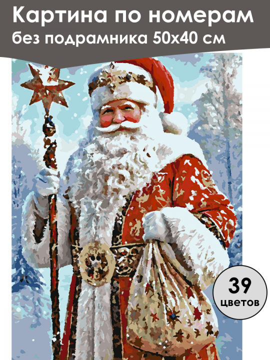Картина по номерам без подрамника, размер 50х40 см, произведена нами. Она включает 40 оттенков и 3231 контуров, что придаёт ей глубину цвета и плавные переходы. Картина выглядит более ярко и живо. В комплект входит глянцевый лак, которым можно покрыть работу по желанию. Краски имеют хорошую укрывистость, хватает двух проходов что бы закрасить символы на схеме. Так же они сохраняют текстуру мазков, не растекаясь и не разглаживаясь полностью на холсте. При покрытии глянцевым лаком создаётся эффект приближенный к масляной живописи. Краски упакованы герметично, что сохраняет их жидкими. Все необходимые инструменты для начала работы также входят в комплект. Мы не используем экосольвентные чернила, которые содержат свинец и могут быть вредны для здоровья. Наши картины напечатаны безопасными водными пигментными чернилами, обеспечивающими чёткое изображение и легко читаемые обозначения. Холст плотный, имеет мелкую зернистость, легко разглаживается и устойчив к сминанию. Картина поставляется в бурой коробке. Следует отметить, что картина без подрамника её нельзя натянуть на подрамник из-за узких краёв, она предназначена для оформления в рамочку. Дед Мороз в красном меховом наряде с белой отделкой и шапкой, держащий в одной руке мешок с подарками, а в другой - украшенный звёздой посох, на фоне заснеженного зимнего леса.