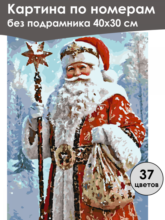 Картина по номерам без подрамника, размер 40х30 см, произведена нами. Она включает 40 оттенков и 2730 контуров, что придаёт ей глубину цвета и плавные переходы. Картина выглядит более ярко и живо. В комплект входит глянцевый лак, которым можно покрыть работу по желанию. Краски имеют хорошую укрывистость, хватает двух проходов что бы закрасить символы на схеме. Так же они сохраняют текстуру мазков, не растекаясь и не разглаживаясь полностью на холсте. При покрытии глянцевым лаком создаётся эффект приближенный к масляной живописи. Краски упакованы герметично, что сохраняет их жидкими. Все необходимые инструменты для начала работы также входят в комплект. Мы не используем экосольвентные чернила, которые содержат свинец и могут быть вредны для здоровья. Наши картины напечатаны безопасными водными пигментными чернилами, обеспечивающими чёткое изображение и легко читаемые обозначения. Холст плотный, имеет мелкую зернистость, легко разглаживается и устойчив к сминанию. Картина поставляется в бурой коробке. Следует отметить, что картина без подрамника её нельзя натянуть на подрамник из-за узких краёв, она предназначена для оформления в рамочку. Дед Мороз в красном меховом наряде с белой отделкой и шапкой, держащий в одной руке мешок с подарками, а в другой - украшенный звёздой посох, на фоне заснеженного зимнего леса.