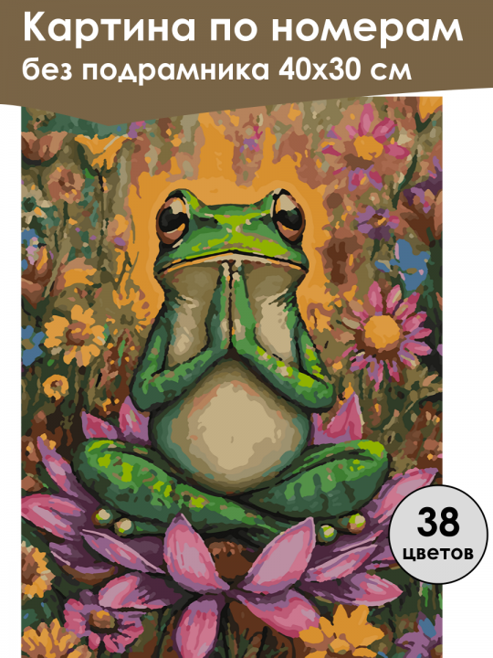 Картина по номерам без подрамника, размер 40х30 см, произведена нами. Она включает 40 оттенков и 2822 контуров, что придаёт ей глубину цвета и плавные переходы. Картина выглядит более ярко и живо. В комплект входит глянцевый лак, которым можно покрыть работу по желанию. Краски имеют хорошую укрывистость, хватает двух проходов что бы закрасить символы на схеме. Так же они сохраняют текстуру мазков, не растекаясь и не разглаживаясь полностью на холсте. При покрытии глянцевым лаком создаётся эффект приближенный к масляной живописи. Краски упакованы герметично, что сохраняет их жидкими. Все необходимые инструменты для начала работы также входят в комплект. Мы не используем экосольвентные чернила, которые содержат свинец и могут быть вредны для здоровья. Наши картины напечатаны безопасными водными пигментными чернилами, обеспечивающими чёткое изображение и легко читаемые обозначения. Холст плотный, имеет мелкую зернистость, легко разглаживается и устойчив к сминанию. Картина поставляется в бурой коробке. Следует отметить, что картина без подрамника её нельзя натянуть на подрамник из-за узких краёв, она предназначена для оформления в рамочку. Яркая и красочная картина, где лягушка в позе лотоса сидит на большом розово-фиолетовом цветке с закрытыми глазами и сложенными в молитве лапами, окружённом множеством разнообразных цветов на фоне из оранжево-коричневых оттенков.