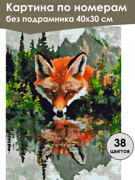Картина по номерам без подрамника, размер 40х30 см, произведена нами. Она включает 40 оттенков и 2704 контуров, что придаёт ей глубину цвета и плавные переходы. Картина выглядит более ярко и живо. В комплект входит глянцевый лак, которым можно покрыть работу по желанию. Краски имеют хорошую укрывистость, хватает двух проходов что бы закрасить символы на схеме. Так же они сохраняют текстуру мазков, не растекаясь и не разглаживаясь полностью на холсте. При покрытии глянцевым лаком создаётся эффект приближенный к масляной живописи. Краски упакованы герметично, что сохраняет их жидкими. Все необходимые инструменты для начала работы также входят в комплект. Мы не используем экосольвентные чернила, которые содержат свинец и могут быть вредны для здоровья. Наши картины напечатаны безопасными водными пигментными чернилами, обеспечивающими чёткое изображение и легко читаемые обозначения. Холст плотный, имеет мелкую зернистость, легко разглаживается и устойчив к сминанию. Картина поставляется в бурой коробке. Следует отметить, что картина без подрамника её нельзя натянуть на подрамник из-за узких краёв, она предназначена для оформления в рамочку. Фантазийное изображение, на котором крупная рыжая лиса склоняется над зеркальной гладью озера, отражающего её изображение, на фоне видны высокие ели и величественные горы.