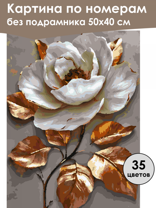 Картина по номерам без подрамника, размер 50х40 см, произведена нами. Она включает 40 оттенков и 1518 контуров, что придаёт ей глубину цвета и плавные переходы. Картина выглядит более ярко и живо. В комплект входит глянцевый лак, которым можно покрыть работу по желанию. Краски имеют хорошую укрывистость, хватает двух проходов что бы закрасить символы на схеме. Так же они сохраняют текстуру мазков, не растекаясь и не разглаживаясь полностью на холсте. При покрытии глянцевым лаком создаётся эффект приближенный к масляной живописи. Краски упакованы герметично, что сохраняет их жидкими. Все необходимые инструменты для начала работы также входят в комплект. Мы не используем экосольвентные чернила, которые содержат свинец и могут быть вредны для здоровья. Наши картины напечатаны безопасными водными пигментными чернилами, обеспечивающими чёткое изображение и легко читаемые обозначения. Холст плотный, имеет мелкую зернистость, легко разглаживается и устойчив к сминанию. Картина поставляется в бурой коробке. Следует отметить, что картина без подрамника её нельзя натянуть на подрамник из-за узких краёв, она предназначена для оформления в рамочку. Стилизованное изображение белой розы с множеством лепестков, окружённой медно-золотыми листьями на сером фоне, создающее контраст между нежными оттенками цветка и насыщенными тонами листьев.