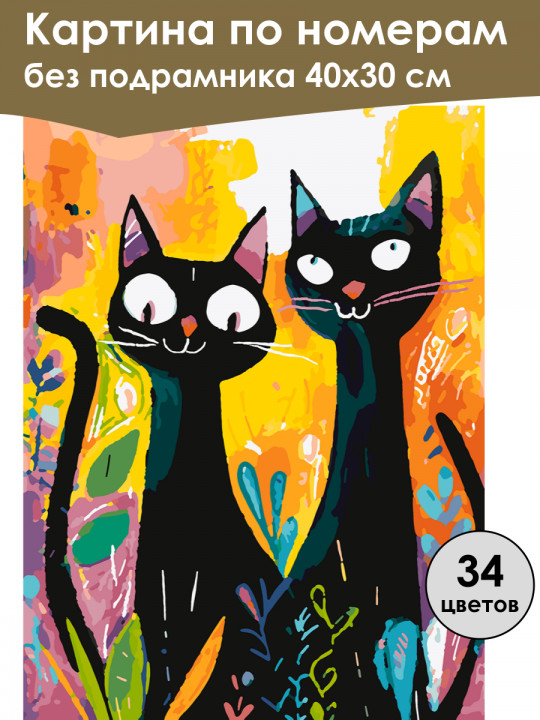 Картина по номерам без подрамника, размер 40х30 см, произведена нами. Она включает 40 оттенков и 845 контуров, что придаёт ей глубину цвета и плавные переходы. Картина выглядит более ярко и живо. В комплект входит глянцевый лак, которым можно покрыть работу по желанию. Краски имеют хорошую укрывистость, хватает двух проходов что бы закрасить символы на схеме. Так же они сохраняют текстуру мазков, не растекаясь и не разглаживаясь полностью на холсте. При покрытии глянцевым лаком создаётся эффект приближенный к масляной живописи. Краски упакованы герметично, что сохраняет их жидкими. Все необходимые инструменты для начала работы также входят в комплект. Мы не используем экосольвентные чернила, которые содержат свинец и могут быть вредны для здоровья. Наши картины напечатаны безопасными водными пигментными чернилами, обеспечивающими чёткое изображение и легко читаемые обозначения. Холст плотный, имеет мелкую зернистость, легко разглаживается и устойчив к сминанию. Картина поставляется в бурой коробке. Следует отметить, что картина без подрамника её нельзя натянуть на подрамник из-за узких краёв, она предназначена для оформления в рамочку. Два черных кота с большими белыми глазами и розовыми ушками, стоящие рядом на фоне ярких, разноцветных пятен, напоминающих абстрактные растения и солнечные лучи, создающие жизнерадостное и игривое настроение.