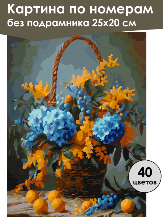 Картина по номерам без подрамника, размер 25х20 см, произведена нами. Она включает 40 оттенков и 1374 контуров, что придаёт ей глубину цвета и плавные переходы. Картина выглядит более ярко и живо. В комплект входит глянцевый лак, которым можно покрыть работу по желанию. Краски качественные, имеют хорошую укрывистость, хватает двух проходов что бы закрасить символы на схеме. Они упакованы герметично, что сохраняет их жидкими. Все необходимые инструменты для начала работы также включены в комплект. Мы не используем экосольвентные чернила, которые содержат свинец и могут быть вредны для здоровья. Наши картины напечатаны безопасными водными пигментными чернилами, обеспечивающими чёткое изображение и легко читаемые обозначения. Холст плотный, имеет мелкую зернистость, легко разглаживается и устойчив к сминанию. Картина поставляется в бурой коробке. Следует отметить, что картина без подрамника её нельзя натянуть на подрамник из-за узких краёв, она предназначена для оформления в рамочку. Плетёная корзина наполнена цветами: яркими жёлтыми мимозами и голубыми гортензиями, украшенными зелёными листьями, на фоне которых лежат разбросанные апельсины.