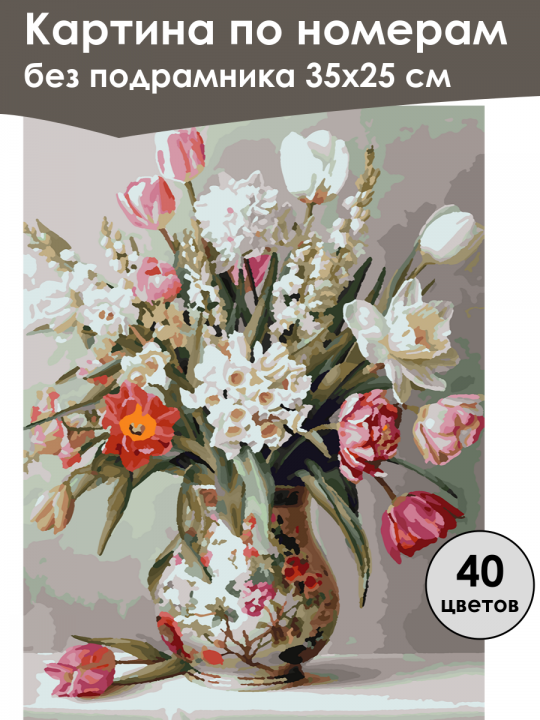 Картина по номерам без подрамника, размер 35х25 см, произведена нами. Она включает 40 оттенков и 2104 контуров, что придаёт ей глубину цвета и плавные переходы. Картина выглядит более ярко и живо. В комплект входит глянцевый лак, которым можно покрыть работу по желанию. Краски качественные, имеют хорошую укрывистость, хватает двух проходов что бы закрасить символы на схеме. Они упакованы герметично, что сохраняет их жидкими. Все необходимые инструменты для начала работы также включены в комплект. Мы не используем экосольвентные чернила, которые содержат свинец и могут быть вредны для здоровья. Наши картины напечатаны безопасными водными пигментными чернилами, обеспечивающими чёткое изображение и легко читаемые обозначения. Холст плотный, имеет мелкую зернистость, легко разглаживается и устойчив к сминанию. Картина поставляется в защищённой бурой коробке. Следует отметить, что картина без подрамника её нельзя натянуть на подрамник из-за узких краёв, она предназначена для оформления в рамочку. Букет цветов в старинной декоративной вазе с узорами; среди цветов выделяются тюльпаны и нарциссы различных оттенков, от белого до ярко-красного, они придают картине ощущение свежести и весны, ваза стоит на светлой поверхности, а общий стиль рисунка напоминает акварельную живопись.