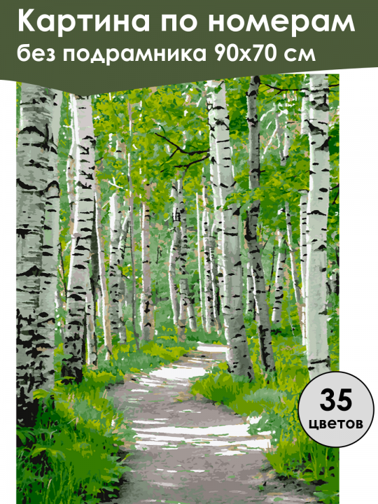 Картина по номерам без подрамника, размер 90х70 см, произведена нами. Она включает 40 оттенков и 7832 контуров, что придаёт ей глубину цвета и плавные переходы. Картина выглядит более ярко и живо. В комплект входит глянцевый лак, которым можно покрыть работу по желанию. Краски имеют хорошую укрывистость, хватает двух проходов что бы закрасить символы на схеме. Так же они сохраняют текстуру мазков, не растекаясь и не разглаживаясь полностью на холсте. При покрытии глянцевым лаком создаётся эффект приближенный к масляной живописи. Краски упакованы герметично, что сохраняет их жидкими. Все необходимые инструменты для начала работы также входят в комплект. Мы не используем экосольвентные чернила, которые содержат свинец и могут быть вредны для здоровья. Наши картины напечатаны безопасными водными пигментными чернилами, обеспечивающими чёткое изображение и легко читаемые обозначения. Холст плотный, имеет мелкую зернистость, легко разглаживается и устойчив к сминанию. Картина поставляется в защищённом буром тубусе. Следует отметить, что картина без подрамника её нельзя натянуть на подрамник из-за узких краёв, она предназначена для оформления в рамочку. Живописная тропинка, ведущая через густой лес с белоствольными берёзами, зелёной листвой и яркими солнечными бликами, создающими уютную и умиротворяющую атмосферу.