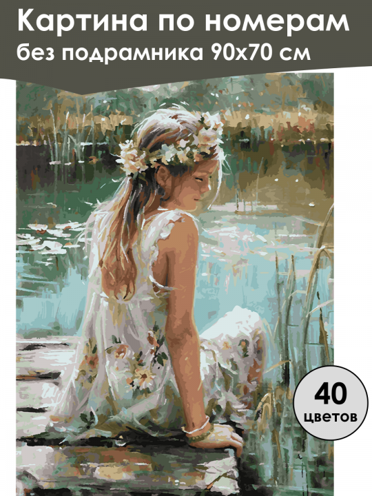 Картина по номерам без подрамника, размер 90х70 см, произведена нами. Она включает 40 оттенков и 6321 контуров, что придаёт ей глубину цвета и плавные переходы. Картина выглядит более ярко и живо. В комплект входит глянцевый лак, которым можно покрыть работу по желанию. Краски имеют хорошую укрывистость, хватает двух проходов что бы закрасить символы на схеме. Так же они сохраняют текстуру мазков, не растекаясь и не разглаживаясь полностью на холсте. При покрытии глянцевым лаком создаётся эффект приближенный к масляной живописи. Краски упакованы герметично, что сохраняет их жидкими. Все необходимые инструменты для начала работы также входят в комплект. Мы не используем экосольвентные чернила, которые содержат свинец и могут быть вредны для здоровья. Наши картины напечатаны безопасными водными пигментными чернилами, обеспечивающими чёткое изображение и легко читаемые обозначения. Холст плотный, имеет мелкую зернистость, легко разглаживается и устойчив к сминанию. Картина поставляется в защищённом буром тубусе. Следует отметить, что картина без подрамника её нельзя натянуть на подрамник из-за узких краёв, она предназначена для оформления в рамочку. Девочка, сидящая у воды на деревянном мостике; её светлые волосы украшены венком из цветов, а платье с яркими цветочными узорами гармонично сочетается с зелёно-голубыми оттенками природы вокруг.