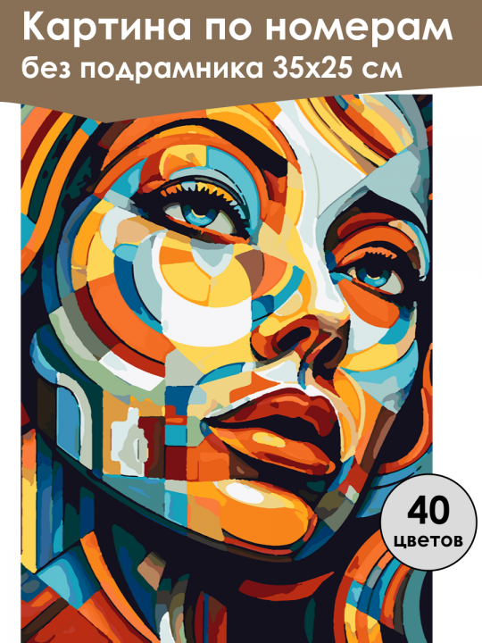Картина по номерам без подрамника, размер 35х25 см, произведена нами. Она включает 40 оттенков и 882 контуров, что придаёт ей глубину цвета и плавные переходы. Картина выглядит более ярко и живо. В комплект входит глянцевый лак, которым можно покрыть работу по желанию. Краски качественные, имеют хорошую укрывистость, хватает двух проходов что бы закрасить символы на схеме. Они упакованы герметично, что сохраняет их жидкими. Все необходимые инструменты для начала работы также включены в комплект. Мы не используем экосольвентные чернила, которые содержат свинец и могут быть вредны для здоровья. Наши картины напечатаны безопасными водными пигментными чернилами, обеспечивающими чёткое изображение и легко читаемые обозначения. Холст плотный, имеет мелкую зернистость, легко разглаживается и устойчив к сминанию. Картина поставляется в защищённой бурой коробке. Следует отметить, что картина без подрамника её нельзя натянуть на подрамник из-за узких краёв, она предназначена для оформления в рамочку. Портрет девушки в абстрактном стиле, с яркими, контрастными цветами, такими как оранжевый, синий и жёлтый, создающими динамичные геометрические узоры, подчёркивающие её черты лица и создающие эффект глубины и объёма.
