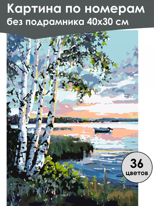 Картина по номерам без подрамника, размер 40х30 см, произведена нами. Она включает 40 оттенков и 3002 контуров, что придаёт ей глубину цвета и плавные переходы. Картина выглядит более ярко и живо. В комплект входит глянцевый лак, которым можно покрыть работу по желанию. Краски имеют хорошую укрывистость, хватает двух проходов что бы закрасить символы на схеме. Так же они сохраняют текстуру мазков, не растекаясь и не разглаживаясь полностью на холсте. При покрытии глянцевым лаком создаётся эффект приближенный к масляной живописи. Краски упакованы герметично, что сохраняет их жидкими. Все необходимые инструменты для начала работы также входят в комплект. Мы не используем экосольвентные чернила, которые содержат свинец и могут быть вредны для здоровья. Наши картины напечатаны безопасными водными пигментными чернилами, обеспечивающими чёткое изображение и легко читаемые обозначения. Холст плотный, имеет мелкую зернистость, легко разглаживается и устойчив к сминанию. Картина поставляется в бурой коробке. Следует отметить, что картина без подрамника её нельзя натянуть на подрамник из-за узких краёв, она предназначена для оформления в рамочку. Пейзаж: берег реки, усыпанный зеленью и деревьями, на переднем плане стоят стройные берёзы с бело-чёрными стволами, вдалеке виден лодка на воде, небо окрашено в оттенки розового и голубого, отражая закат или рассвет; природа передаётся в светлых и тёплых тонах, создавая атмосферу спокойствия и гармонии.