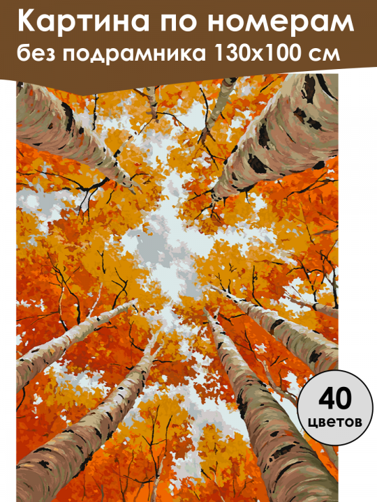 Картина по номерам без подрамника, размер 130х100 см, произведена нами. Она включает 40 оттенков и 6539 контуров, что придаёт ей глубину цвета и плавные переходы. Картина выглядит более ярко и живо. В комплект входит глянцевый лак, которым можно покрыть работу по желанию. Краски имеют хорошую укрывистость, хватает двух проходов что бы закрасить символы на схеме. Так же они сохраняют текстуру мазков, не растекаясь и не разглаживаясь полностью на холсте. При покрытии глянцевым лаком создаётся эффект приближенный к масляной живописи. Краски упакованы герметично, что сохраняет их жидкими. Все необходимые инструменты для начала работы также входят в комплект. Мы не используем экосольвентные чернила, которые содержат свинец и могут быть вредны для здоровья. Наши картины напечатаны безопасными водными пигментными чернилами, обеспечивающими чёткое изображение и легко читаемые обозначения. Холст плотный, имеет мелкую зернистость, легко разглаживается и устойчив к сминанию. Картина поставляется в защищённом буром тубусе. Следует отметить, что картина без подрамника её нельзя натянуть на подрамник из-за узких краёв, она предназначена для оформления в рамочку. Вид с земли вверх на осенний лес, где высокие деревья стремятся к небу; их стволы покрыты светлой корой, а кроны наполнены яркими оранжевыми и желтыми листьями, которые создают красочный контраст на фоне голубого неба.