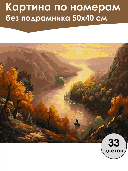 Картина по номерам без подрамника, размер 50х40 см, произведена нами. Она включает 40 оттенков и 2190 контуров, что придаёт ей глубину цвета и плавные переходы. Картина выглядит более ярко и живо. В комплект входит глянцевый лак, которым можно покрыть работу по желанию. Краски имеют хорошую укрывистость, хватает двух проходов что бы закрасить символы на схеме. Так же они сохраняют текстуру мазков, не растекаясь и не разглаживаясь полностью на холсте. При покрытии глянцевым лаком создаётся эффект приближенный к масляной живописи. Краски упакованы герметично, что сохраняет их жидкими. Все необходимые инструменты для начала работы также входят в комплект. Мы не используем экосольвентные чернила, которые содержат свинец и могут быть вредны для здоровья. Наши картины напечатаны безопасными водными пигментными чернилами, обеспечивающими чёткое изображение и легко читаемые обозначения. Холст плотный, имеет мелкую зернистость, легко разглаживается и устойчив к сминанию. Картина поставляется в бурой коробке. Следует отметить, что картина без подрамника её нельзя натянуть на подрамник из-за узких краёв, она предназначена для оформления в рамочку. Речная долина в осенних тонах с оранжево-жёлтыми деревьями по обеим сторонам извилистой реки, которая мягко отражает закатное небо; вдали виден силуэт человека в лодке, плывущего по спокойной воде.