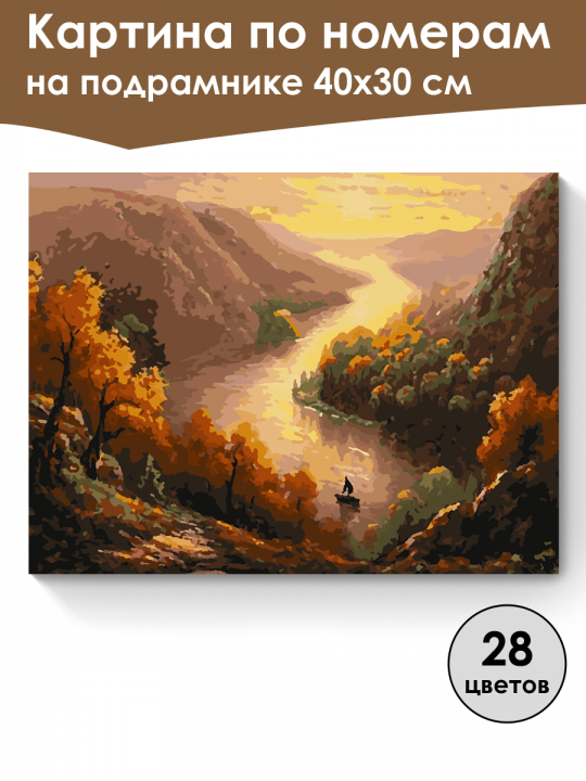 Картина по номерам на подрамнике, размер 40х30 см, произведена нами. Она включает 40 оттенков и 1277 контуров, что придаёт ей глубину цвета и плавные переходы. Картина выглядит более ярко и живо. В комплект входит глянцевый лак, которым можно покрыть работу по желанию. Краски имеют хорошую укрывистость, хватает двух проходов что бы закрасить символы на схеме. Так же они сохраняют текстуру мазков, не растекаясь и не разглаживаясь полностью на холсте. При покрытии глянцевым лаком создаётся эффект приближенный к масляной живописи. Краски упакованы герметично, что сохраняет их жидкими. Все необходимые инструменты для начала работы также включены в комплект, в том числе и крепления на стену. В картине используется крепкий подрамник со специальной вставкой, которая предотвращает провисание холста во время рисования. Это обеспечивает комфортный процесс работы и гарантирует, что холст всегда будет оставаться хорошо натянутым. Мы не используем экосольвентные чернила, которые содержат свинец и могут быть вредны для здоровья. Наши картины напечатаны безопасными водными пигментными чернилами, обеспечивающими чёткое изображение и легко читаемые обозначения. Холст плотный, имеет мелкую зернистость, легко разглаживается и устойчив к сминанию. Картина поставляется в защищённой бурой коробке. Речная долина в осенних тонах с оранжево-жёлтыми деревьями по обеим сторонам извилистой реки, которая мягко отражает закатное небо; вдали виден силуэт человека в лодке, плывущего по спокойной воде.