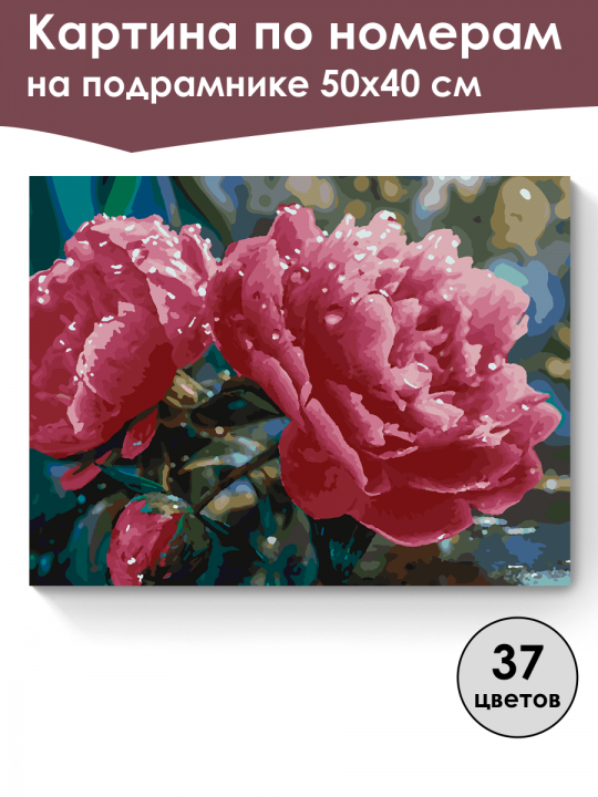 Картина по номерам на подрамнике, размер 50х40 см, произведена нами. Она включает 40 оттенков и 1837 контуров, что придаёт ей глубину цвета и плавные переходы. Картина выглядит более ярко и живо. В комплект входит глянцевый лак, которым можно покрыть работу по желанию. Краски имеют хорошую укрывистость, хватает двух проходов что бы закрасить символы на схеме. Так же они сохраняют текстуру мазков, не растекаясь и не разглаживаясь полностью на холсте. При покрытии глянцевым лаком создаётся эффект приближенный к масляной живописи. Краски упакованы герметично, что сохраняет их жидкими. Все необходимые инструменты для начала работы также включены в комплект, в том числе и крепления на стену. В картине используется крепкий подрамник со специальной вставкой, которая предотвращает провисание холста во время рисования. Это обеспечивает комфортный процесс работы и гарантирует, что холст всегда будет оставаться хорошо натянутым. Мы не используем экосольвентные чернила, которые содержат свинец и могут быть вредны для здоровья. Наши картины напечатаны безопасными водными пигментными чернилами, обеспечивающими чёткое изображение и легко читаемые обозначения. Холст плотный, имеет мелкую зернистость, легко разглаживается и устойчив к сминанию. Картина поставляется в защищённой бурой коробке. Два ярко-розовых цветка пионов с каплями воды на лепестках, которые создают иллюзию росы; фон размыт и содержит оттенки зелёного, синего и коричневого, создавая контраст и подчёркивая красоту цветов.