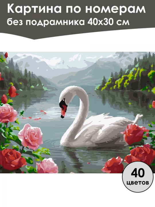 Картина по номерам без подрамника, размер 40х30 см, произведена нами. Она включает 40 оттенков и 1405 контуров, что придаёт ей глубину цвета и плавные переходы. Картина выглядит более ярко и живо. В комплект входит глянцевый лак, которым можно покрыть работу по желанию. Краски имеют хорошую укрывистость, хватает двух проходов что бы закрасить символы на схеме. Так же они сохраняют текстуру мазков, не растекаясь и не разглаживаясь полностью на холсте. При покрытии глянцевым лаком создаётся эффект приближенный к масляной живописи. Краски упакованы герметично, что сохраняет их жидкими. Все необходимые инструменты для начала работы также входят в комплект. Мы не используем экосольвентные чернила, которые содержат свинец и могут быть вредны для здоровья. Наши картины напечатаны безопасными водными пигментными чернилами, обеспечивающими чёткое изображение и легко читаемые обозначения. Холст плотный, имеет мелкую зернистость, легко разглаживается и устойчив к сминанию. Картина поставляется в бурой коробке. Следует отметить, что картина без подрамника её нельзя натянуть на подрамник из-за узких краёв, она предназначена для оформления в рамочку. Белый лебедь грациозно плывёт по тихому озеру, окружённому живописными зелёными лесами и величественными горами на фоне, в воде отражаются нежные розы, распустившиеся вокруг озера, добавляя яркие акценты к спокойствию природной сцены.