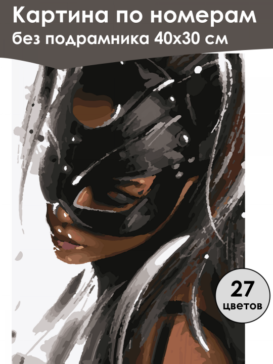 Картина по номерам без подрамника, размер 40х30 см, произведена нами. Она включает 40 оттенков и 1346 контуров, что придаёт ей глубину цвета и плавные переходы. Картина выглядит более ярко и живо. В комплект входит глянцевый лак, которым можно покрыть работу по желанию. Краски имеют хорошую укрывистость, хватает двух проходов что бы закрасить символы на схеме. Так же они сохраняют текстуру мазков, не растекаясь и не разглаживаясь полностью на холсте. При покрытии глянцевым лаком создаётся эффект приближенный к масляной живописи. Краски упакованы герметично, что сохраняет их жидкими. Все необходимые инструменты для начала работы также входят в комплект. Мы не используем экосольвентные чернила, которые содержат свинец и могут быть вредны для здоровья. Наши картины напечатаны безопасными водными пигментными чернилами, обеспечивающими чёткое изображение и легко читаемые обозначения. Холст плотный, имеет мелкую зернистость, легко разглаживается и устойчив к сминанию. Картина поставляется в бурой коробке. Следует отметить, что картина без подрамника её нельзя натянуть на подрамник из-за узких краёв, она предназначена для оформления в рамочку. Художественная иллюстрация с женским лицом, частично скрытым под чёрной маской с заклёпками, её кожа и губы освещены, а длинные волосы развеваются, создавая контраст между светлыми и тёмными оттенками.