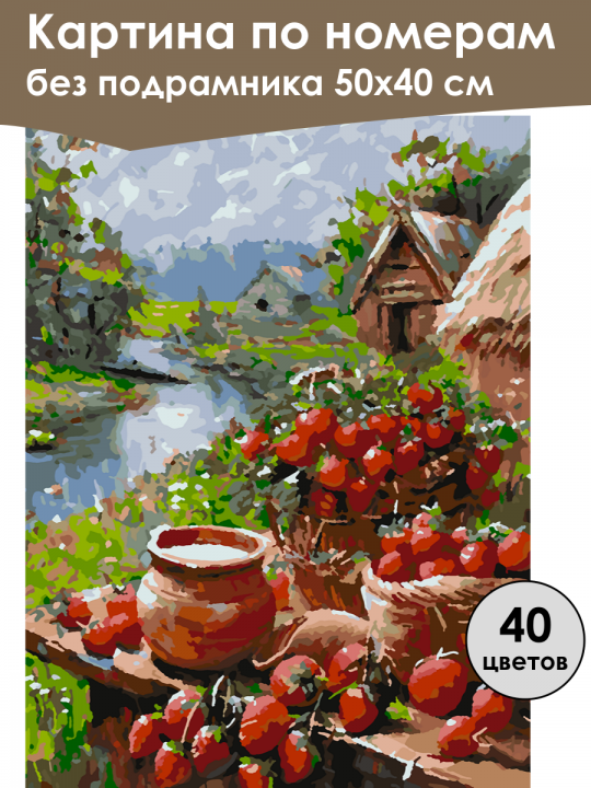 Картина по номерам без подрамника, размер 50х40 см, произведена нами. Она включает 40 оттенков и 3046 контуров, что придаёт ей глубину цвета и плавные переходы. Картина выглядит более ярко и живо. В комплект входит глянцевый лак, которым можно покрыть работу по желанию. Краски имеют хорошую укрывистость, хватает двух проходов что бы закрасить символы на схеме. Так же они сохраняют текстуру мазков, не растекаясь и не разглаживаясь полностью на холсте. При покрытии глянцевым лаком создаётся эффект приближенный к масляной живописи. Краски упакованы герметично, что сохраняет их жидкими. Все необходимые инструменты для начала работы также входят в комплект. Мы не используем экосольвентные чернила, которые содержат свинец и могут быть вредны для здоровья. Наши картины напечатаны безопасными водными пигментными чернилами, обеспечивающими чёткое изображение и легко читаемые обозначения. Холст плотный, имеет мелкую зернистость, легко разглаживается и устойчив к сминанию. Картина поставляется в бурой коробке. Следует отметить, что картина без подрамника её нельзя натянуть на подрамник из-за узких краёв, она предназначена для оформления в рамочку. Пейзаж с элементами натюрморта выглядит как картина в стиле импрессионизма: корзины и глиняный кувшин с ярко-красными ягодами клубники, стоят на деревянной поверхности на фоне реки, зелёных деревьев и деревенских построек под голубым небом.