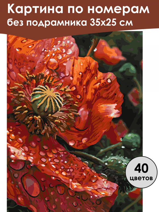 Картина по номерам без подрамника, размер 35х25 см, произведена нами. Она включает 40 оттенков и 2805 контуров, что придаёт ей глубину цвета и плавные переходы. Картина выглядит более ярко и живо. В комплект входит глянцевый лак, которым можно покрыть работу по желанию. Краски качественные, имеют хорошую укрывистость, хватает двух проходов что бы закрасить символы на схеме. Они упакованы герметично, что сохраняет их жидкими. Все необходимые инструменты для начала работы также включены в комплект. Мы не используем экосольвентные чернила, которые содержат свинец и могут быть вредны для здоровья. Наши картины напечатаны безопасными водными пигментными чернилами, обеспечивающими чёткое изображение и легко читаемые обозначения. Холст плотный, имеет мелкую зернистость, легко разглаживается и устойчив к сминанию. Картина поставляется в защищённой бурой коробке. Следует отметить, что картина без подрамника её нельзя натянуть на подрамник из-за узких краёв, она предназначена для оформления в рамочку. Ярко-оранжевый цветок мака с насыщенными красными оттенками, покрытый каплями воды, которые создают эффект росы; лепестки детализированы, фон слегка размытый, что придает изображению художественный характер.