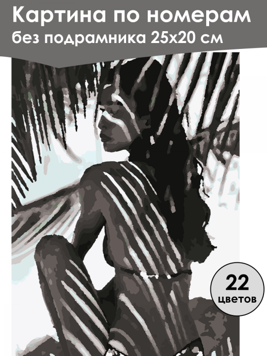 Картина по номерам без подрамника, размер 25х20 см, произведена нами. Она включает 40 оттенков и 1093 контуров, что придаёт ей глубину цвета и плавные переходы. Картина выглядит более ярко и живо. В комплект входит глянцевый лак, которым можно покрыть работу по желанию. Краски качественные, имеют хорошую укрывистость, хватает двух проходов что бы закрасить символы на схеме. Они упакованы герметично, что сохраняет их жидкими. Все необходимые инструменты для начала работы также включены в комплект. Мы не используем экосольвентные чернила, которые содержат свинец и могут быть вредны для здоровья. Наши картины напечатаны безопасными водными пигментными чернилами, обеспечивающими чёткое изображение и легко читаемые обозначения. Холст плотный, имеет мелкую зернистость, легко разглаживается и устойчив к сминанию. Картина поставляется в бурой коробке. Следует отметить, что картина без подрамника её нельзя натянуть на подрамник из-за узких краёв, она предназначена для оформления в рамочку. Девушка в купальнике сидит спиной и повернута в профиль, её лицо и тело освещены полосами света, проходящего сквозь пальмовые листья.