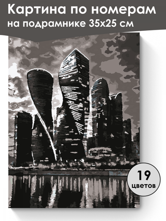 Картина по номерам на подрамнике, размер 35х25 см, произведена нами. Она включает 40 оттенков и 1803 контуров, что придаёт ей глубину цвета и плавные переходы. Картина выглядит более ярко и живо. В комплект входит глянцевый лак, которым можно покрыть работу по желанию. Краски имеют хорошую укрывистость, хватает двух проходов что бы закрасить символы на схеме. Так же они сохраняют текстуру мазков, не растекаясь и не разглаживаясь полностью на холсте. При покрытии глянцевым лаком создаётся эффект приближенный к масляной живописи. Краски упакованы герметично, что сохраняет их жидкими. Все необходимые инструменты для начала работы также включены в комплект, в том числе и крепления на стену. В картине используется крепкий подрамник со специальной вставкой, которая предотвращает провисание холста во время рисования. Это обеспечивает комфортный процесс работы и гарантирует, что холст всегда будет оставаться хорошо натянутым. Мы не используем экосольвентные чернила, которые содержат свинец и могут быть вредны для здоровья. Наши картины напечатаны безопасными водными пигментными чернилами, обеспечивающими чёткое изображение и легко читаемые обозначения. Холст плотный, имеет мелкую зернистость, легко разглаживается и устойчив к сминанию. Картина поставляется в защищённой бурой коробке. Черно-белое стилизованное изображение современных небоскрёбов с изогнутыми линиями и стеклянными фасадами, отражающихся в воде на фоне облачного неба.