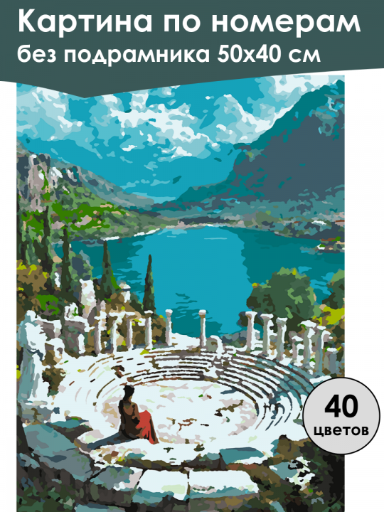 Картина по номерам без подрамника, размер 50х40 см, произведена нами. Она включает 40 оттенков и 2417 контуров, что придаёт ей глубину цвета и плавные переходы. Картина выглядит более ярко и живо. В комплект входит глянцевый лак, которым можно покрыть работу по желанию. Краски имеют хорошую укрывистость, хватает двух проходов что бы закрасить символы на схеме. Так же они сохраняют текстуру мазков, не растекаясь и не разглаживаясь полностью на холсте. При покрытии глянцевым лаком создаётся эффект приближенный к масляной живописи. Краски упакованы герметично, что сохраняет их жидкими. Все необходимые инструменты для начала работы также входят в комплект. Мы не используем экосольвентные чернила, которые содержат свинец и могут быть вредны для здоровья. Наши картины напечатаны безопасными водными пигментными чернилами, обеспечивающими чёткое изображение и легко читаемые обозначения. Холст плотный, имеет мелкую зернистость, легко разглаживается и устойчив к сминанию. Картина поставляется в бурой коробке. Следует отметить, что картина без подрамника её нельзя натянуть на подрамник из-за узких краёв, она предназначена для оформления в рамочку. Женщина, сидящая в древнем амфитеатре на фоне потрясающего пейзажа с голубым озером, окруженным горами и пышной зеленой растительностью под облачным небом.