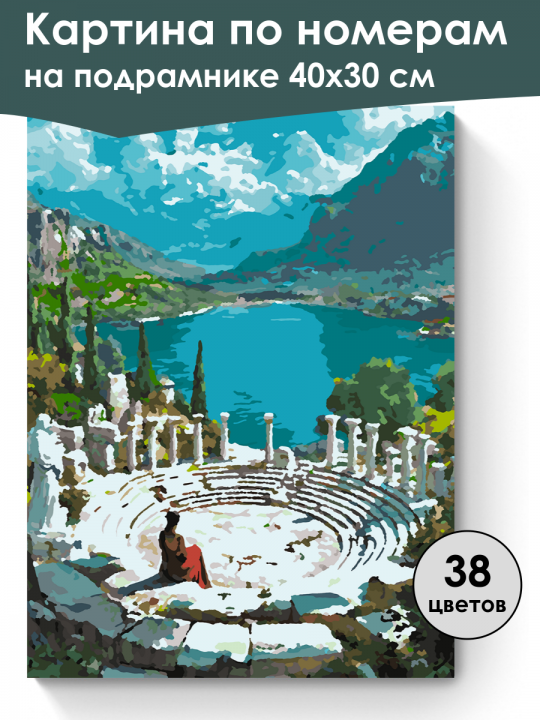 Картина по номерам на подрамнике, размер 40х30 см, произведена нами. Она включает 40 оттенков и 2113 контуров, что придаёт ей глубину цвета и плавные переходы. Картина выглядит более ярко и живо. В комплект входит глянцевый лак, которым можно покрыть работу по желанию. Краски имеют хорошую укрывистость, хватает двух проходов что бы закрасить символы на схеме. Так же они сохраняют текстуру мазков, не растекаясь и не разглаживаясь полностью на холсте. При покрытии глянцевым лаком создаётся эффект приближенный к масляной живописи. Краски упакованы герметично, что сохраняет их жидкими. Все необходимые инструменты для начала работы также включены в комплект, в том числе и крепления на стену. В картине используется крепкий подрамник со специальной вставкой, которая предотвращает провисание холста во время рисования. Это обеспечивает комфортный процесс работы и гарантирует, что холст всегда будет оставаться хорошо натянутым. Мы не используем экосольвентные чернила, которые содержат свинец и могут быть вредны для здоровья. Наши картины напечатаны безопасными водными пигментными чернилами, обеспечивающими чёткое изображение и легко читаемые обозначения. Холст плотный, имеет мелкую зернистость, легко разглаживается и устойчив к сминанию. Картина поставляется в защищённой бурой коробке. Женщина, сидящая в древнем амфитеатре на фоне потрясающего пейзажа с голубым озером, окруженным горами и пышной зеленой растительностью под облачным небом.