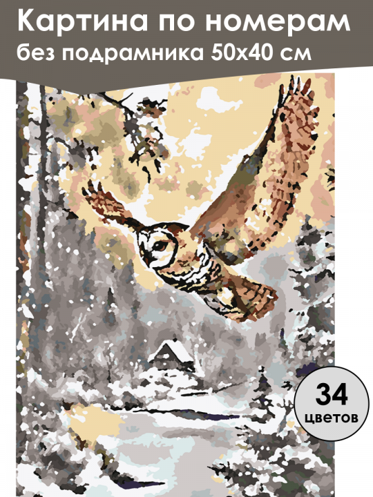 Картина по номерам без подрамника, размер 50х40 см, произведена нами. Она включает 40 оттенков и 3046 контуров, что придаёт ей глубину цвета и плавные переходы. Картина выглядит более ярко и живо. В комплект входит глянцевый лак, которым можно покрыть работу по желанию. Краски имеют хорошую укрывистость, хватает двух проходов что бы закрасить символы на схеме. Так же они сохраняют текстуру мазков, не растекаясь и не разглаживаясь полностью на холсте. При покрытии глянцевым лаком создаётся эффект приближенный к масляной живописи. Краски упакованы герметично, что сохраняет их жидкими. Все необходимые инструменты для начала работы также входят в комплект. Мы не используем экосольвентные чернила, которые содержат свинец и могут быть вредны для здоровья. Наши картины напечатаны безопасными водными пигментными чернилами, обеспечивающими чёткое изображение и легко читаемые обозначения. Холст плотный, имеет мелкую зернистость, легко разглаживается и устойчив к сминанию. Картина поставляется в бурой коробке. Следует отметить, что картина без подрамника её нельзя натянуть на подрамник из-за узких краёв, она предназначена для оформления в рамочку. Стилизованная картина зимнего леса с летящей совой, с широко раскрытыми крыльями в полёте, вокруг разлетаются снежные хлопья, на заднем плане виден заснеженный дом среди деревьев, сцена наполнена тёплыми и холодными оттенками, создающими атмосферу спокойного зимнего вечера.