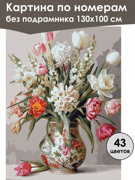 Картина по номерам без подрамника, размер 130х100 см, произведена нами. Она включает 40 оттенков и 3985 контуров, что придаёт ей глубину цвета и плавные переходы. Картина выглядит более ярко и живо. В комплект входит глянцевый лак, которым можно покрыть работу по желанию. Краски имеют хорошую укрывистость, хватает двух проходов что бы закрасить символы на схеме. Так же они сохраняют текстуру мазков, не растекаясь и не разглаживаясь полностью на холсте. При покрытии глянцевым лаком создаётся эффект приближенный к масляной живописи. Краски упакованы герметично, что сохраняет их жидкими. Все необходимые инструменты для начала работы также входят в комплект. Мы не используем экосольвентные чернила, которые содержат свинец и могут быть вредны для здоровья. Наши картины напечатаны безопасными водными пигментными чернилами, обеспечивающими чёткое изображение и легко читаемые обозначения. Холст плотный, имеет мелкую зернистость, легко разглаживается и устойчив к сминанию. Картина поставляется в защищённом буром тубусе. Следует отметить, что картина без подрамника её нельзя натянуть на подрамник из-за узких краёв, она предназначена для оформления в рамочку. Букет цветов в старинной декоративной вазе с узорами; среди цветов выделяются тюльпаны и нарциссы различных оттенков, от белого до ярко-красного, они придают картине ощущение свежести и весны, ваза стоит на светлой поверхности, а общий стиль рисунка напоминает акварельную живопись.
