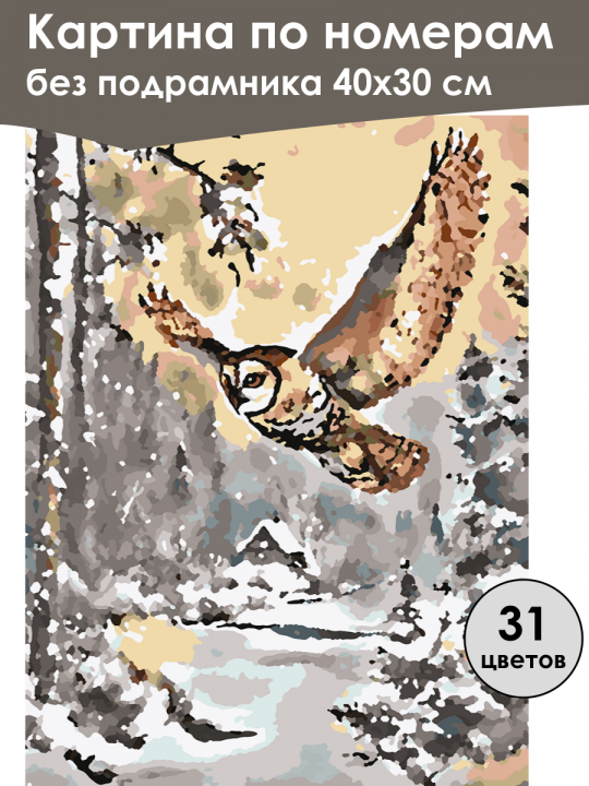 Картина по номерам без подрамника, размер 40х30 см, произведена нами. Она включает 40 оттенков и 2676 контуров, что придаёт ей глубину цвета и плавные переходы. Картина выглядит более ярко и живо. В комплект входит глянцевый лак, которым можно покрыть работу по желанию. Краски имеют хорошую укрывистость, хватает двух проходов что бы закрасить символы на схеме. Так же они сохраняют текстуру мазков, не растекаясь и не разглаживаясь полностью на холсте. При покрытии глянцевым лаком создаётся эффект приближенный к масляной живописи. Краски упакованы герметично, что сохраняет их жидкими. Все необходимые инструменты для начала работы также входят в комплект. Мы не используем экосольвентные чернила, которые содержат свинец и могут быть вредны для здоровья. Наши картины напечатаны безопасными водными пигментными чернилами, обеспечивающими чёткое изображение и легко читаемые обозначения. Холст плотный, имеет мелкую зернистость, легко разглаживается и устойчив к сминанию. Картина поставляется в бурой коробке. Следует отметить, что картина без подрамника её нельзя натянуть на подрамник из-за узких краёв, она предназначена для оформления в рамочку. Стилизованная картина зимнего леса с летящей совой, с широко раскрытыми крыльями в полёте, вокруг разлетаются снежные хлопья, на заднем плане виден заснеженный дом среди деревьев, сцена наполнена тёплыми и холодными оттенками, создающими атмосферу спокойного зимнего вечера.