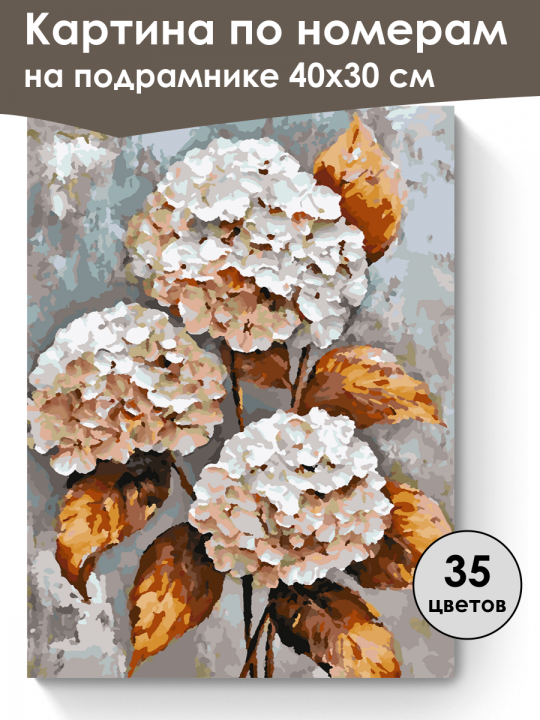 Картина по номерам на подрамнике, размер 40х30 см, произведена нами. Она включает 40 оттенков и 2669 контуров, что придаёт ей глубину цвета и плавные переходы. Картина выглядит более ярко и живо. В комплект входит глянцевый лак, которым можно покрыть работу по желанию. Краски имеют хорошую укрывистость, хватает двух проходов что бы закрасить символы на схеме. Так же они сохраняют текстуру мазков, не растекаясь и не разглаживаясь полностью на холсте. При покрытии глянцевым лаком создаётся эффект приближенный к масляной живописи. Краски упакованы герметично, что сохраняет их жидкими. Все необходимые инструменты для начала работы также включены в комплект, в том числе и крепления на стену. В картине используется крепкий подрамник со специальной вставкой, которая предотвращает провисание холста во время рисования. Это обеспечивает комфортный процесс работы и гарантирует, что холст всегда будет оставаться хорошо натянутым. Мы не используем экосольвентные чернила, которые содержат свинец и могут быть вредны для здоровья. Наши картины напечатаны безопасными водными пигментными чернилами, обеспечивающими чёткое изображение и легко читаемые обозначения. Холст плотный, имеет мелкую зернистость, легко разглаживается и устойчив к сминанию. Картина поставляется в защищённой бурой коробке. Три крупных белых цветка, напоминающих гортензии, с коричневыми и оранжевыми листьями на фоне приглушённых серо-голубых тонов. Цветы и листья выполнены в стиле цифровой живописи с акварельными мазками, создающими эффектную текстуру и мягкие переходы между оттенками, что придаёт изображению элегантную и художественную атмосферу.