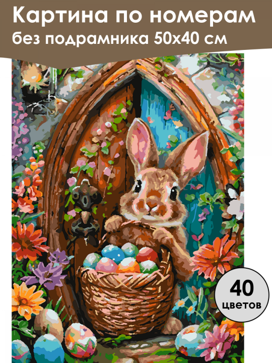 Картина по номерам без подрамника, размер 50х40 см, произведена нами. Она включает 40 оттенков и 3785 контуров, что придаёт ей глубину цвета и плавные переходы. Картина выглядит более ярко и живо. В комплект входит глянцевый лак, которым можно покрыть работу по желанию. Краски имеют хорошую укрывистость, хватает двух проходов что бы закрасить символы на схеме. Так же они сохраняют текстуру мазков, не растекаясь и не разглаживаясь полностью на холсте. При покрытии глянцевым лаком создаётся эффект приближенный к масляной живописи. Краски упакованы герметично, что сохраняет их жидкими. Все необходимые инструменты для начала работы также входят в комплект. Мы не используем экосольвентные чернила, которые содержат свинец и могут быть вредны для здоровья. Наши картины напечатаны безопасными водными пигментными чернилами, обеспечивающими чёткое изображение и легко читаемые обозначения. Холст плотный, имеет мелкую зернистость, легко разглаживается и устойчив к сминанию. Картина поставляется в бурой коробке. Следует отметить, что картина без подрамника её нельзя натянуть на подрамник из-за узких краёв, она предназначена для оформления в рамочку. Красочный пасхальный кролик, держащий корзину, полную разноцветных яиц, стоящий у деревянной двери, обрамленной аркой, вокруг многоцветные цветы, создающие атмосферу весны и праздника; вся сцена исполнена в стильной живописной манере с насыщенной палитрой.