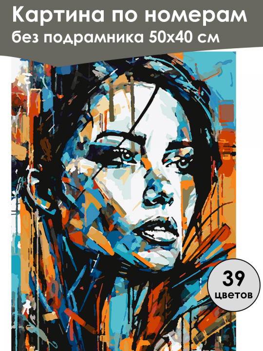 Картина по номерам без подрамника, размер 50х40 см, произведена нами. Она включает 40 оттенков и 2563 контуров, что придаёт ей глубину цвета и плавные переходы. Картина выглядит более ярко и живо. В комплект входит глянцевый лак, которым можно покрыть работу по желанию. Краски имеют хорошую укрывистость, хватает двух проходов что бы закрасить символы на схеме. Так же они сохраняют текстуру мазков, не растекаясь и не разглаживаясь полностью на холсте. При покрытии глянцевым лаком создаётся эффект приближенный к масляной живописи. Краски упакованы герметично, что сохраняет их жидкими. Все необходимые инструменты для начала работы также входят в комплект. Мы не используем экосольвентные чернила, которые содержат свинец и могут быть вредны для здоровья. Наши картины напечатаны безопасными водными пигментными чернилами, обеспечивающими чёткое изображение и легко читаемые обозначения. Холст плотный, имеет мелкую зернистость, легко разглаживается и устойчив к сминанию. Картина поставляется в бурой коробке. Следует отметить, что картина без подрамника её нельзя натянуть на подрамник из-за узких краёв, она предназначена для оформления в рамочку. Абстрактный портрет женщины, выполненный в экспрессивном стиле с использованием ярких оранжевых, синих и черных мазков краски, которые создают сложную текстуру и выражение лица.