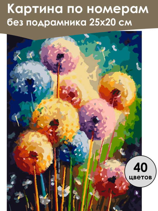 Картина по номерам без подрамника, размер 25х20 см, произведена нами. Она включает 40 оттенков и 1122 контуров, что придаёт ей глубину цвета и плавные переходы. Картина выглядит более ярко и живо. В комплект входит глянцевый лак, которым можно покрыть работу по желанию. Краски качественные, имеют хорошую укрывистость, хватает двух проходов что бы закрасить символы на схеме. Они упакованы герметично, что сохраняет их жидкими. Все необходимые инструменты для начала работы также включены в комплект. Мы не используем экосольвентные чернила, которые содержат свинец и могут быть вредны для здоровья. Наши картины напечатаны безопасными водными пигментными чернилами, обеспечивающими чёткое изображение и легко читаемые обозначения. Холст плотный, имеет мелкую зернистость, легко разглаживается и устойчив к сминанию. Картина поставляется в бурой коробке. Следует отметить, что картина без подрамника её нельзя натянуть на подрамник из-за узких краёв, она предназначена для оформления в рамочку. Абстрактная композиция в стиле пуантилизма с разноцветными одуванчиками на стеблях, выполненная в ярких акварельных тонах, на фоне тёмно-зелёного и голубого цвета, создавая впечатление ночного пейзажа с дуновением ветра.