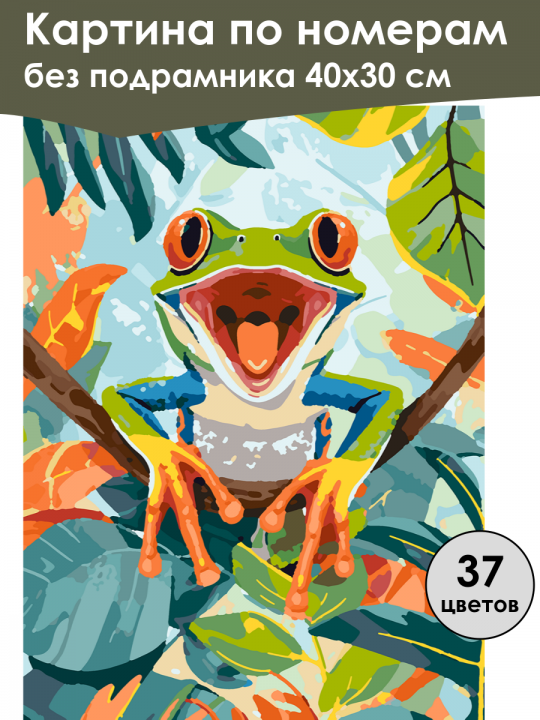 Картина по номерам без подрамника, размер 40х30 см, произведена нами. Она включает 40 оттенков и 907 контуров, что придаёт ей глубину цвета и плавные переходы. Картина выглядит более ярко и живо. В комплект входит глянцевый лак, которым можно покрыть работу по желанию. Краски имеют хорошую укрывистость, хватает двух проходов что бы закрасить символы на схеме. Так же они сохраняют текстуру мазков, не растекаясь и не разглаживаясь полностью на холсте. При покрытии глянцевым лаком создаётся эффект приближенный к масляной живописи. Краски упакованы герметично, что сохраняет их жидкими. Все необходимые инструменты для начала работы также входят в комплект. Мы не используем экосольвентные чернила, которые содержат свинец и могут быть вредны для здоровья. Наши картины напечатаны безопасными водными пигментными чернилами, обеспечивающими чёткое изображение и легко читаемые обозначения. Холст плотный, имеет мелкую зернистость, легко разглаживается и устойчив к сминанию. Картина поставляется в бурой коробке. Следует отметить, что картина без подрамника её нельзя натянуть на подрамник из-за узких краёв, она предназначена для оформления в рамочку. Красочная лягушка с крупными оранжевыми глазами и зеленым телом, сидящая на ветке в окружении пышных листьев; лягушка широко открыла рот, демонстрируя оранжевые пальцы, расположенные на фоне разнообразной зелени и оттенков синего и оранжевого.